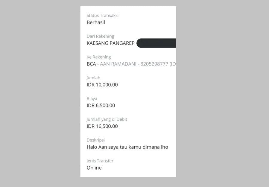 6. Tak berhenti di situ, Kaesang juga semakin memancing tawa ketika mengunggah bukti transfer sebesar Rp10 ribu dengan tulisan <i>"Halo Aan saya tau kamu dimana lho". </i>