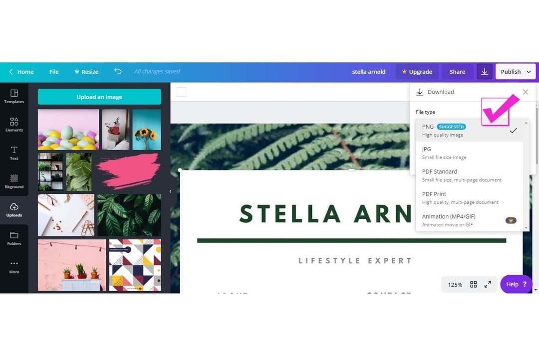 5. Jika sudah selesai mendesain dan mengisi konten, cek kembali hasilnya. Jangan sampai ada typo dan informasi yang tertinggal. Jika sudah yakin CV milikmu sudah sempurna, kamu tinggal klik download dengan pilihan format JPEG, PDF, PNG dan MP4.