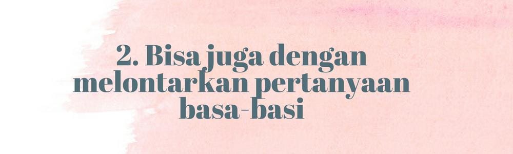 Pertanyaan basa-basi juga membantumu untuk membuat percakapan dengan orang baru. Kamu dapat menanyakan kabarnya, cuaca hari ini, atau kegiatan yang ia lakukan selama liburan kemarin. Selain bertanya padanya, kamu perlu membagikan hal yang sama dengannya sehingga pembicaraan nggak terkesan seperti wawancara.