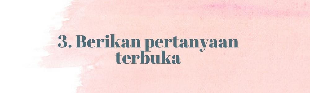 Pertanyaan terbuka dapat membawa percakapanmu jadi lebih panjang bersama lawan bicaramu. Bahas topik sederhana, seperti, "Apa kamu suka olahraga?", "kalau boleh tahu, kamu alumni kampus mana, ya?", "Suka baca buku?", dan sebagainya.