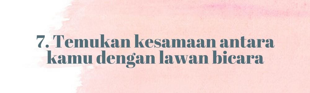 Sebuah persamaan antara kamu dan lawan bicara dapat memperpanjang dan memperluas percakapan kalian! Mulai dengan topik yang paling sederhana, seperti musik favorit, hobinya, destinasi yang ia kunjungi jika liburan, dan sebagainya.