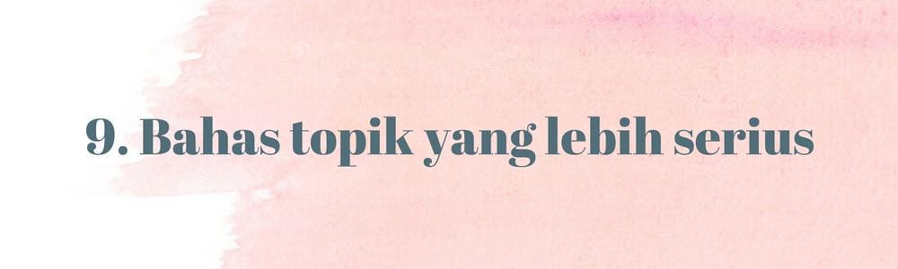 Dari membahas topik yang ringan, kamu dapat mengangkat topik yang lebih berat secara perlahan. Bukan seputar politik atau hukum, loh. Bela. Topik yang lebih serius bisa seperti, "Siapa orang yang paling berperngaruh dalam hidupmu?", "Apa yang kamu suka dari dirimu sendiri?", "Coba deskripsikan definisi bahagia versi kamu!".