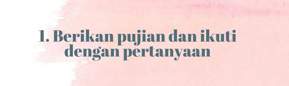 Mulailah pembicaraanmu dengan memberikan pujian pada lawan bicaramu. Kamu bisa memuji penampilannya, atau apapun yang berkaitan dengannya. Jangan lakukan secara berlebihan, kemudian iringi dengan pertanyaan agar percakapan dapat berlanjut. Contohnya, "Kemejamu bagus, cocok dengan gayamu. Kalau boleh tahu beli di mana?"