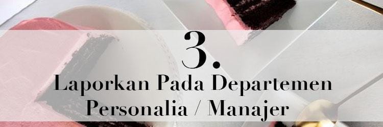 Bagi beberapa korban, melaporkan kejadian pelecehan yang dialami adalah hal yang memalukan. Ini adalah pikiran yang salah, karena jika tidak segera dilaporkan, kejadian bisa jadi berulang. Tak hanya padamu saja, bisa saja pelecehan terjadi pada sahabat di kantormu. Segera laporkan pada departemen personalia dan bawa bukti-bukti yang dibutuhkan.