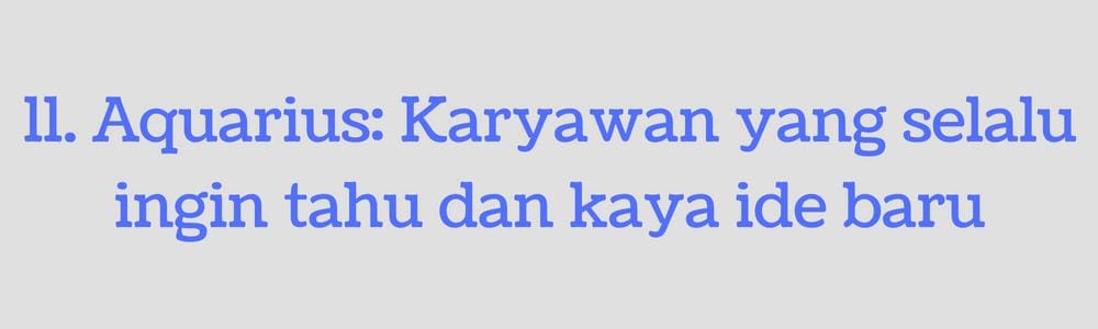 Karyawan berzodiak Aquarius adalah sosok yang selalu ingin tahu dan berjiwa inovatif. Ia pun selalu menantang dirinya untuk maju agar nggak terjebak dalam status quo, salah satunya selalu berada di posisi kerja yang sama. Aquarius dapat ditegur karena membuat sesuatu jadi semakin rumit. Namun terlepas dari kelemahan itu, zodiak air ini memiliki pemikiran yang nggak hanya membawa dirinya untuk berkembang, tetapi juga perusahaan tempat ia bekerja.