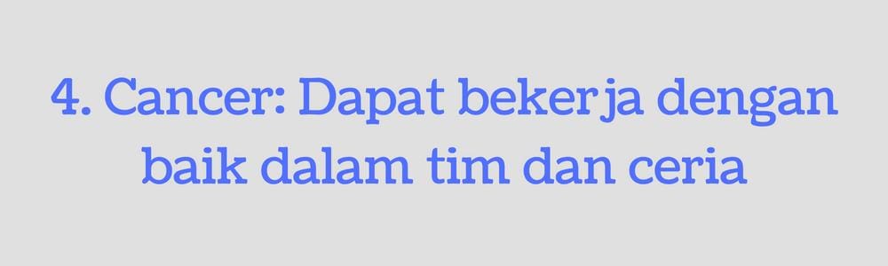 Pribadi Cancer akan menjadi sosok yang selalu membawa kehangatan dan semangat dalam kantor. Ia akan menjadi rekan kerja yang baik dalam sebuah tim dengan kepribadian yang mudah tersenyum. Namun, salah mengkritik dirinya akan membuat ia marah besar dalam jangka waktu yang lama. Selain itu, Cancer sering mengemban banyak tanggung jawab dan dapat melaksanakannya dengan baik. Jika merasa kebutuhan emosionalnya teah terpenuhi, ia bahkan akan menjadi rekan kerja yang setia.