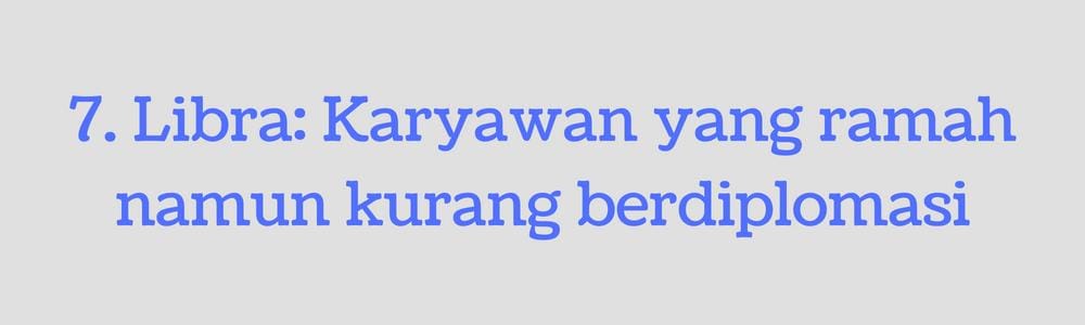 Dengan kepribadiannya yang ramah, Libra adalah akan menjadi karyawan yang jago berkomunikasi. Namun, ia pun nggak dapat bersikap adil dan berkepala dingin. Karyawan berzodiak Libra nggak dapat berada di lingkungan dengan penuh tekanan karena akan melemahkan semangat kerja mereka, membuatnya dapat disalahkan karena dianggap menjauh dari masalah.