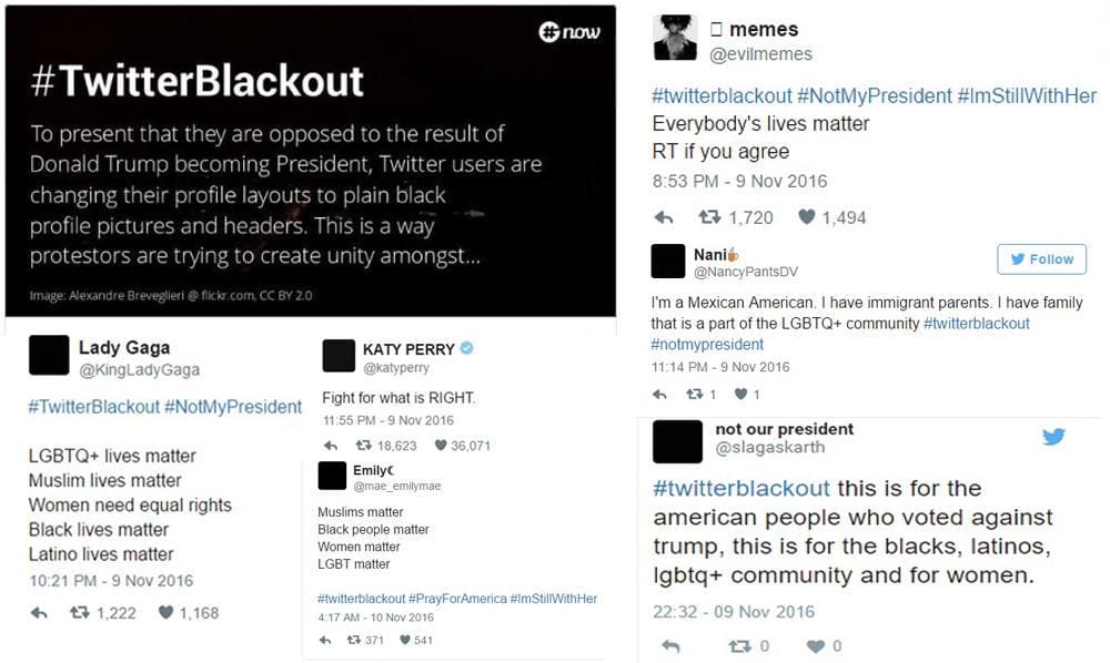 1. Sebagian warga Amerika termasuk para selebritas mengekspresikan kekesalan mereka atas terpilihnya Trump dengan mengganti profile picture Twitter mereka dengan warna hitam, menggunakan tagar #ImStillWithHer, hingga menggunakan #NotMyPresident.