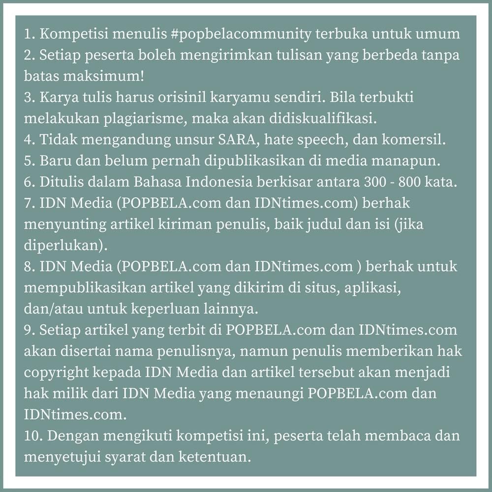 Tenang, jangan bersedih kalau kamu ketinggalan mengikuti kompetisi menulis Popbela chapter II. Karena Popbela justru memperpanjang kompetisi menulis chapter II ini hingga 20 Mei! So, kamu masih punya kesempatan menghasilkan karya tulisan dan meraih hadiah total Rp 5 juta, Bela. Hitung-hitung bisa dapat uang bulanan tambahan dan Tunjangan Hari Raya (THR). Apalagi di chapter II ini, Popbela juga baru menambahkan tema artikel untuk menyambut bulan Ramadan, Bela.