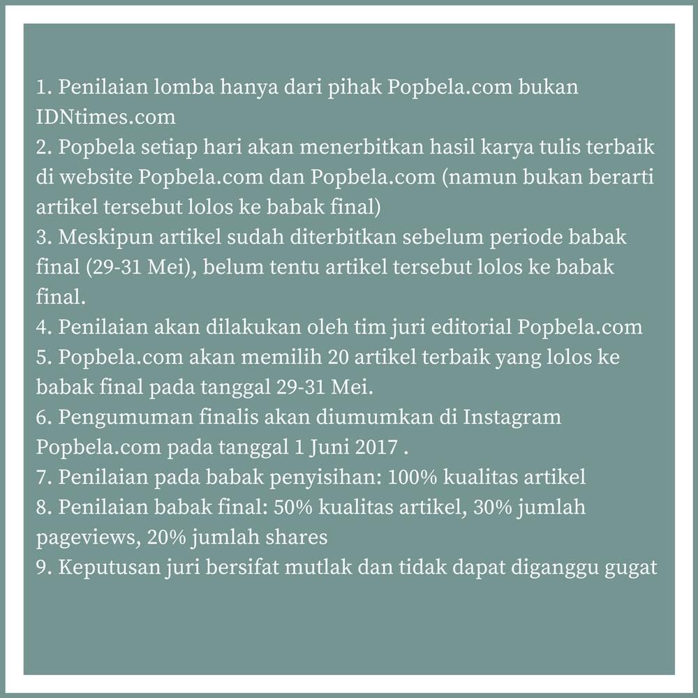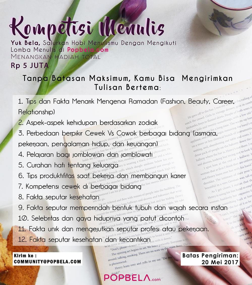 Popbela.com menunggu artikelmu sebelum 20 Mei 2017 ya.