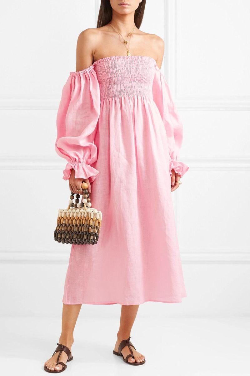 Atlanta off-the-shoulder shirred linen midi dress, Sleeper, $308.13