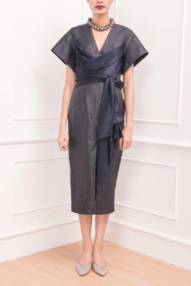 Navy back detail with front ribbon midi dress, Reves Studio, IDR 1.680.000