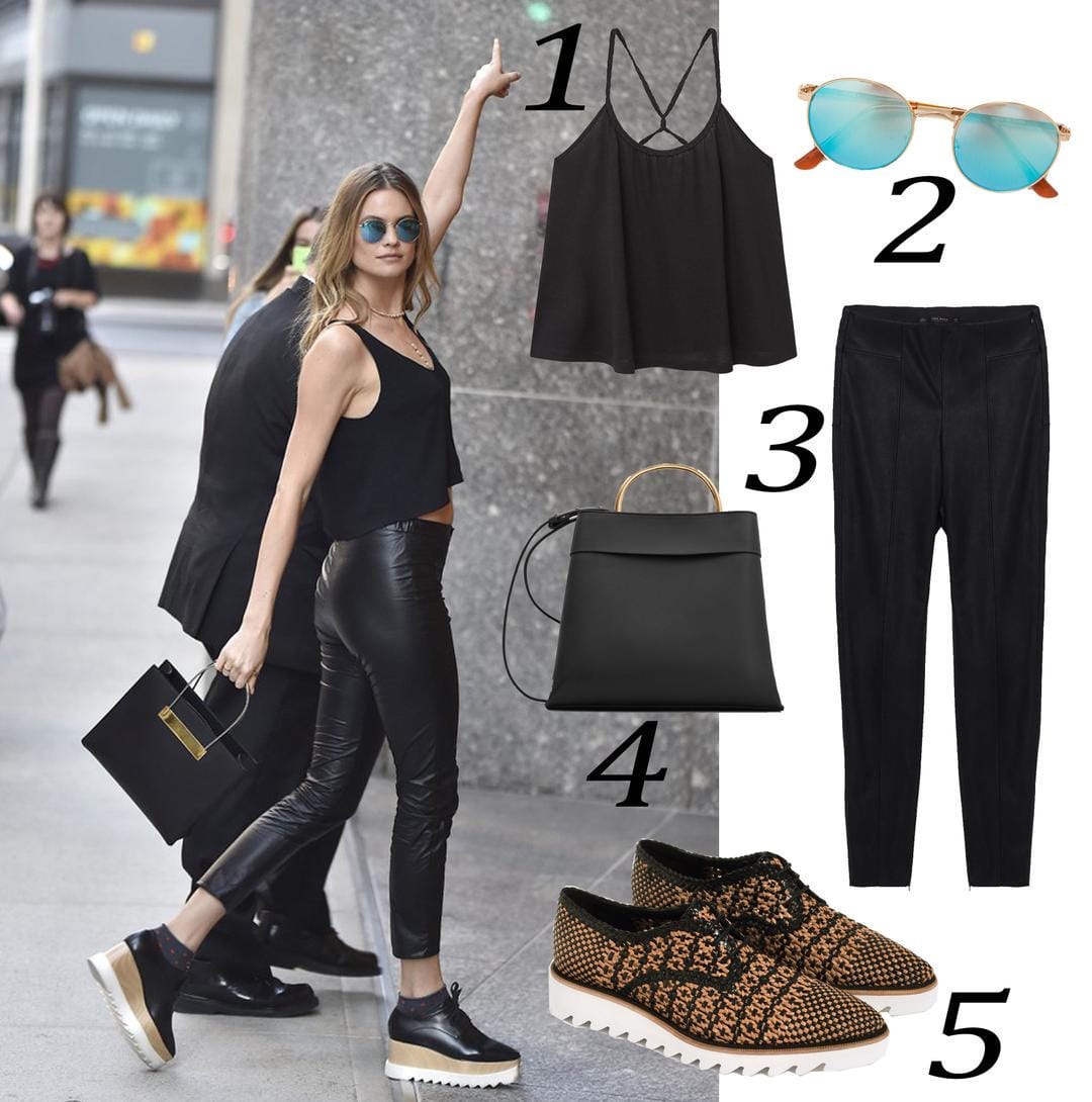 Hitam menjadi warna paling aman sekaligus chic dalam sebuah padu-padan. Cukup tambahkan satu warna yang jreng, dan kamu bisa mendapatkan total look yang statement. Behati Prinsloo pun menerapkan hal tersebut. Gaya kasualnya banyak memiliki poin yang menarik. Mulau dari cropped top, leather legging, hingga kacamata mirrored lense yang membuat gayanya makin cool.