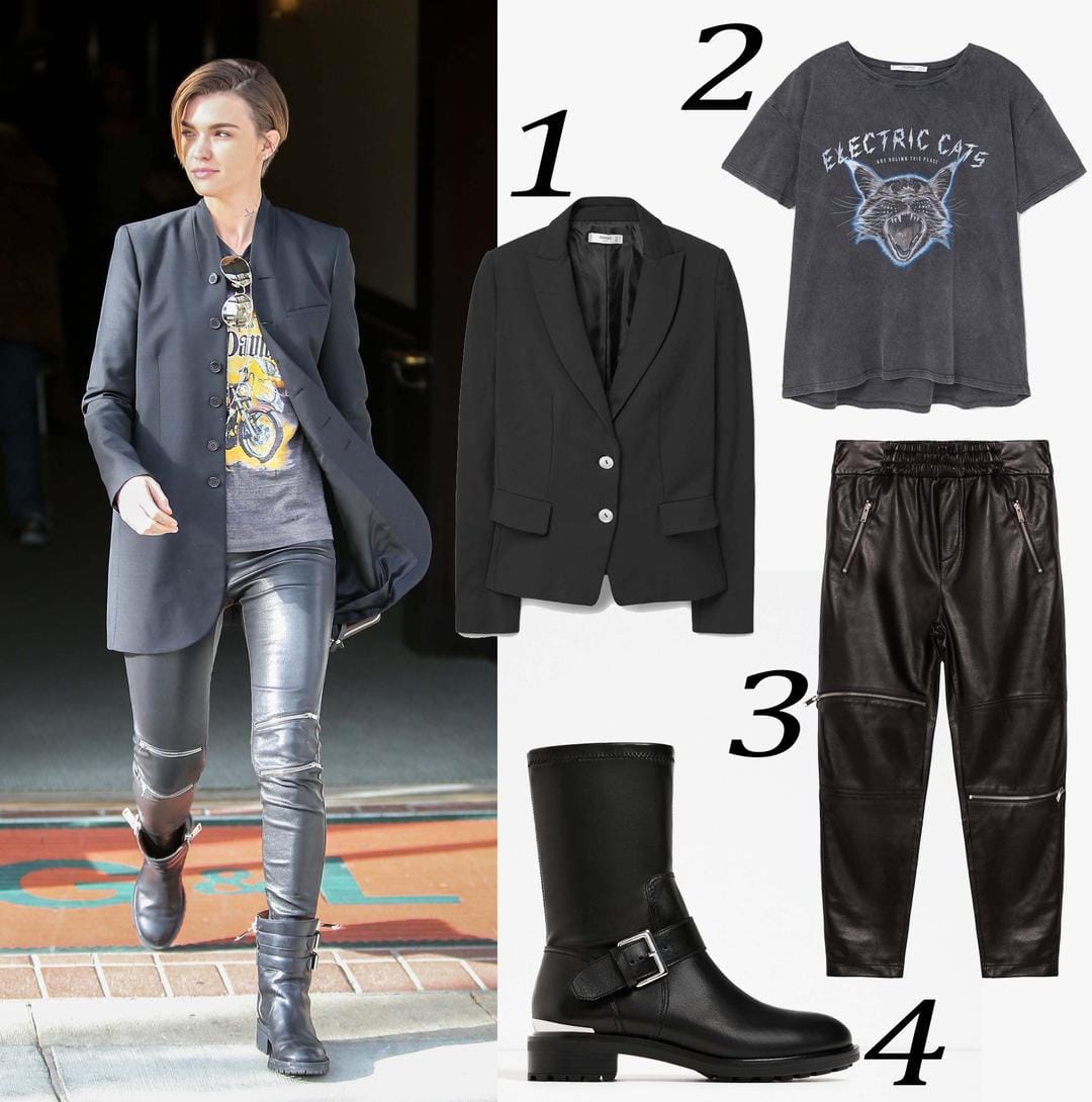 Dengan gayanya yang tomboy, Ruby Rose sudah terlihat keren mengenakan apa pun. Apalagi saat ia tampil super rock n roll! Jiwanya ada banget kan! Untuk meniru gaya tangguh ala Ruby Rose ini ternyata cukup mudah lho. Kamu cukup mengkombinasikan blazer klasik dengan t-shirt grafis yang menarik. Sementara kunci untuk semakin menghidupkan kesan rock n roll terletak pada celana kulit aksen zipper dan biker boots yang statement.