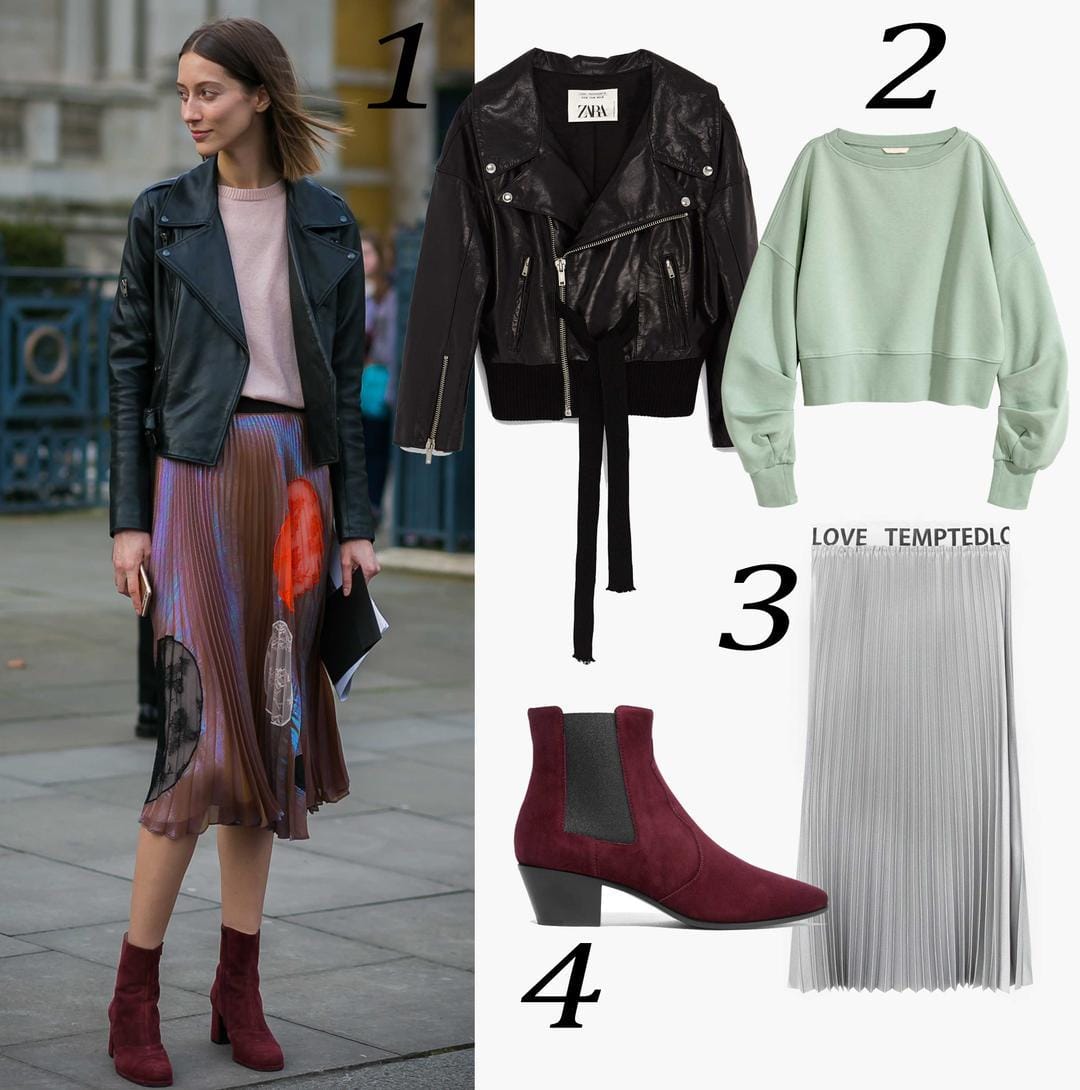 Buat gaya femininmu lebih tangguh dengan inspirasi padu-padan dari top model Alana Zimmer ini. Cukup kombinasikan rok pleats kamu dengan jaket kulit kesayangan. Lalu untuk menyempurnakan tampilan ini jangan lupa untuk mengenakan ankle boots.