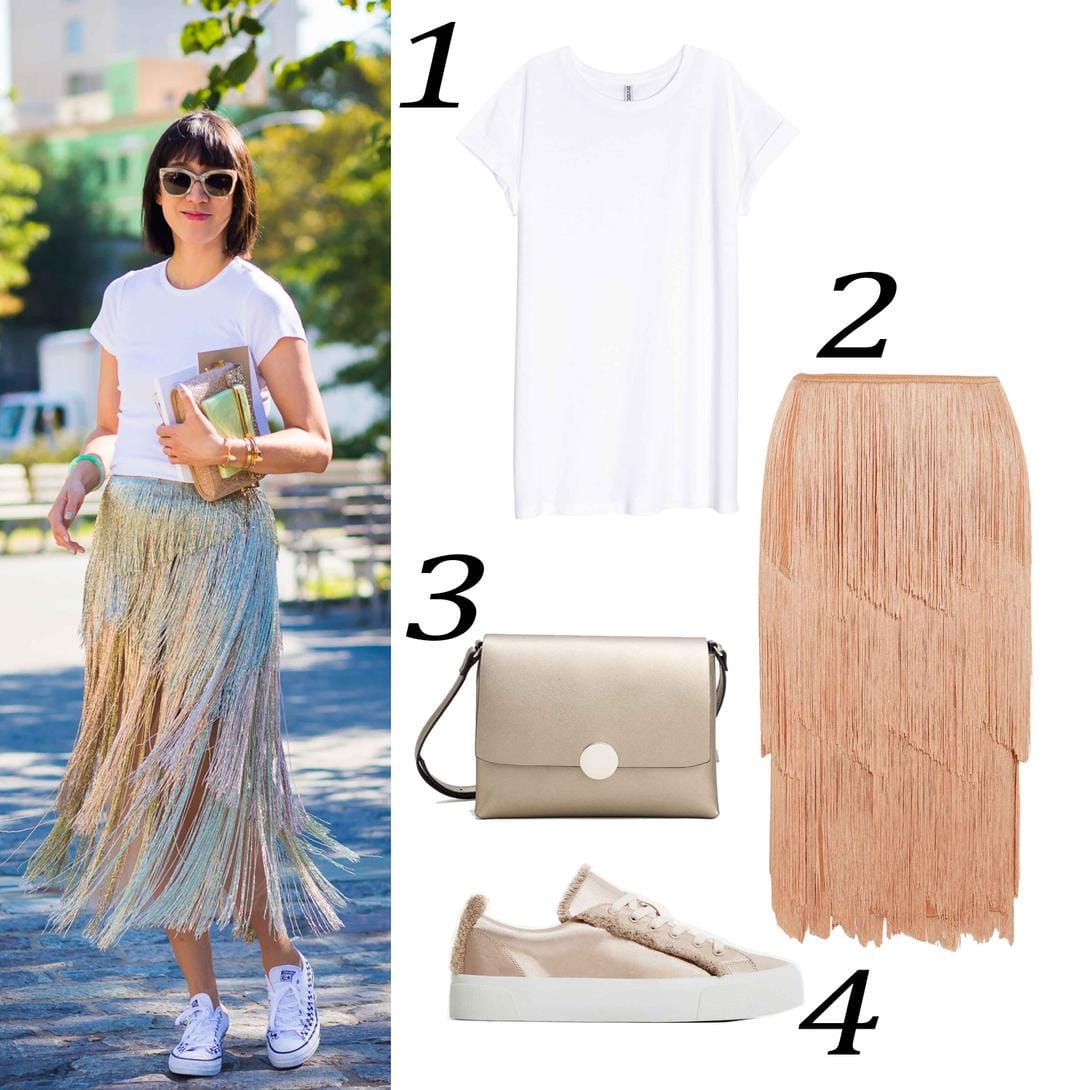 Yang benar cuma pakai t-shirt putih bisa keliatan keren? of course yes. Kuncinya ada pada styling-an yang tepat. Contoh gaya si Eva Chen ini. Cuma mengenakan t-shirt putih, ia berhasil terlihat chic dengan padu-padan rok beraksen fringe. Untuk menambah kesan muda, pilihan sepatu sneakers rasanya yang paling oke.
