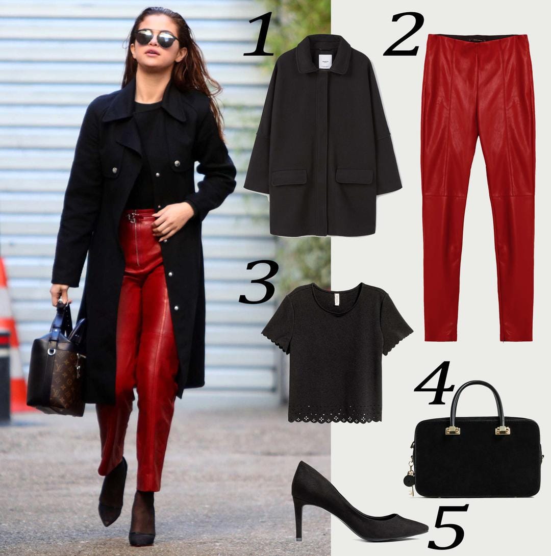 Salah satu trik untuk tampil seksi walau dengan busana tertutup adalah bermain dengan warna. Seperti yang dilakukan oleh Selena Gomez. Pemakaian celana kulit berwarna merah yang kontras menjadi poin yang menarik dari look-nya kali ini. Kesan seksi juga dibalut dengan unsur misterius lewat coat hitam yang menutup tubuh rampingnya.