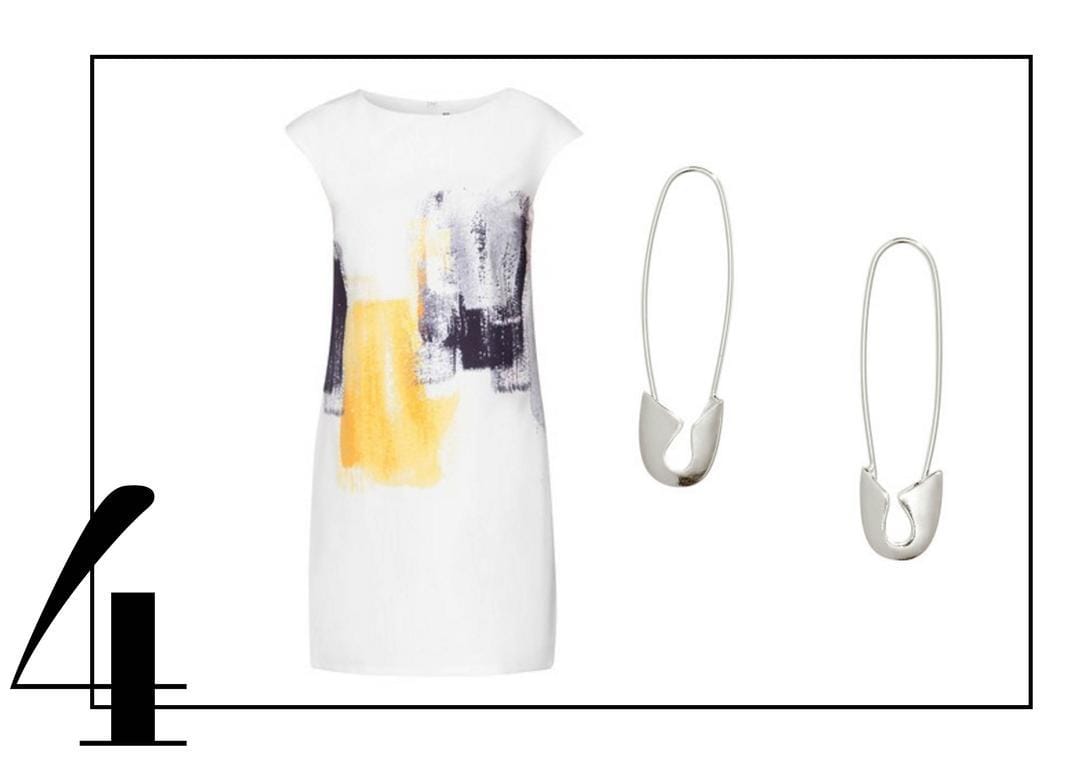 GET THE LOOK: Abstract shift dress, ZALORA, IDR 299,900; Statement earrings, H&M, IDR 69,900