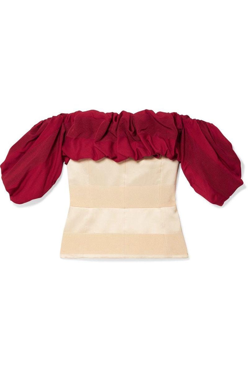 Off-the-shoulder ruffled paneled jacquard blouse, Hellessy, $823