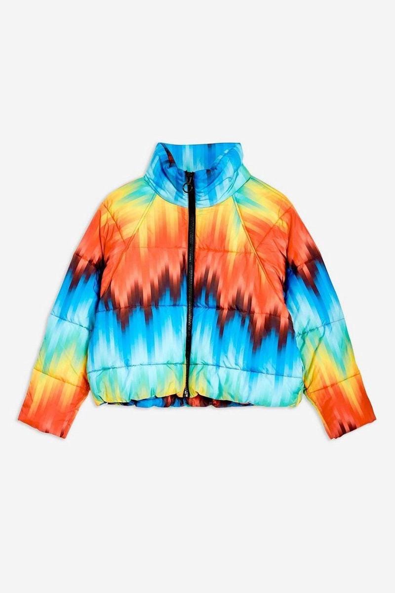 Rainbow puffer jacket, Topshop, $110