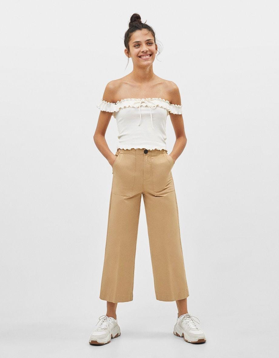 Off-the-shoulder T-shirt with lettuce-edge trim, Bershka, IDR 199,900
