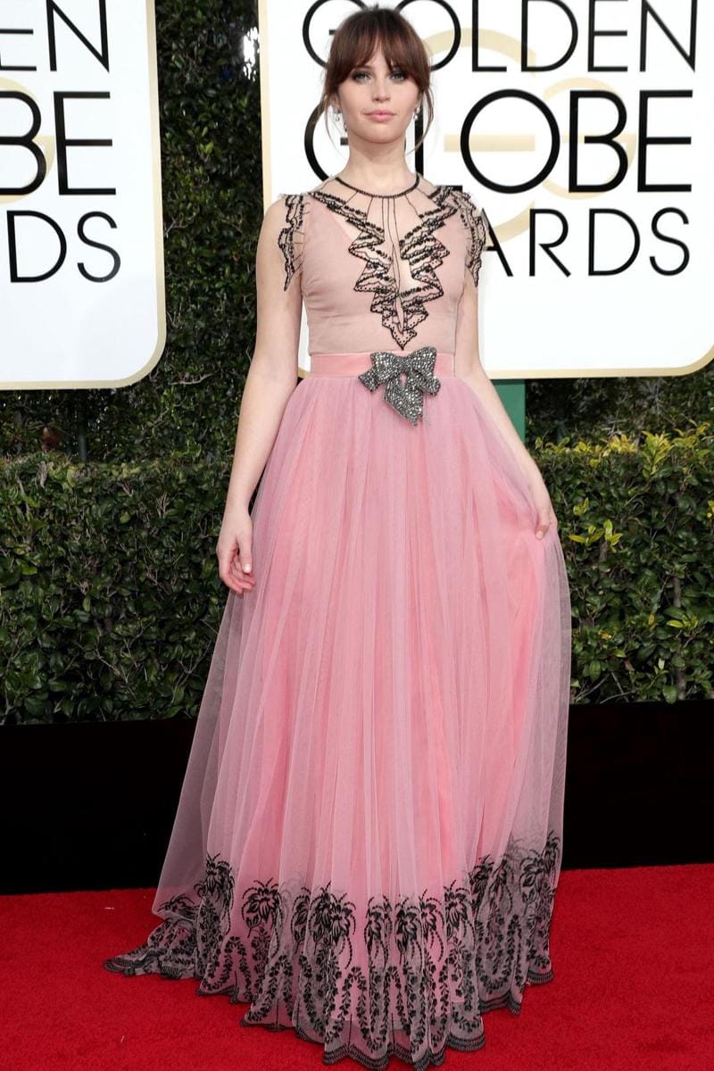 9. Warna pink memang selalu bisa jadi andalan terlihat menawan! Seperti gaun berpotongan a-line yang dikenakan Felicity pada acara Golden Globe 2017.