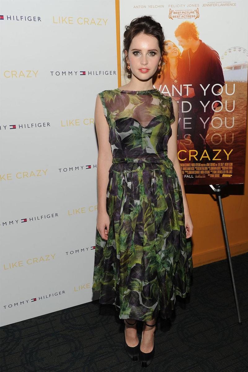 1. Di awal kemunculannya tahun 2014, Felicity terlihat sangat chic dalam balutan sheer floral dress pada pemutaran perdana Like Crazy.