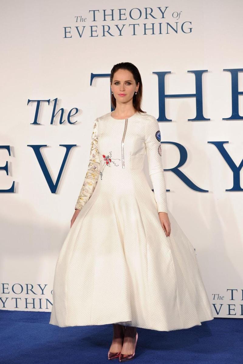 2. Masih di tahun 2014, pada gala premier The Theory of Everything di London, gaun putih karya Dior terlihat super stunning dikenakan oleh Felicity.