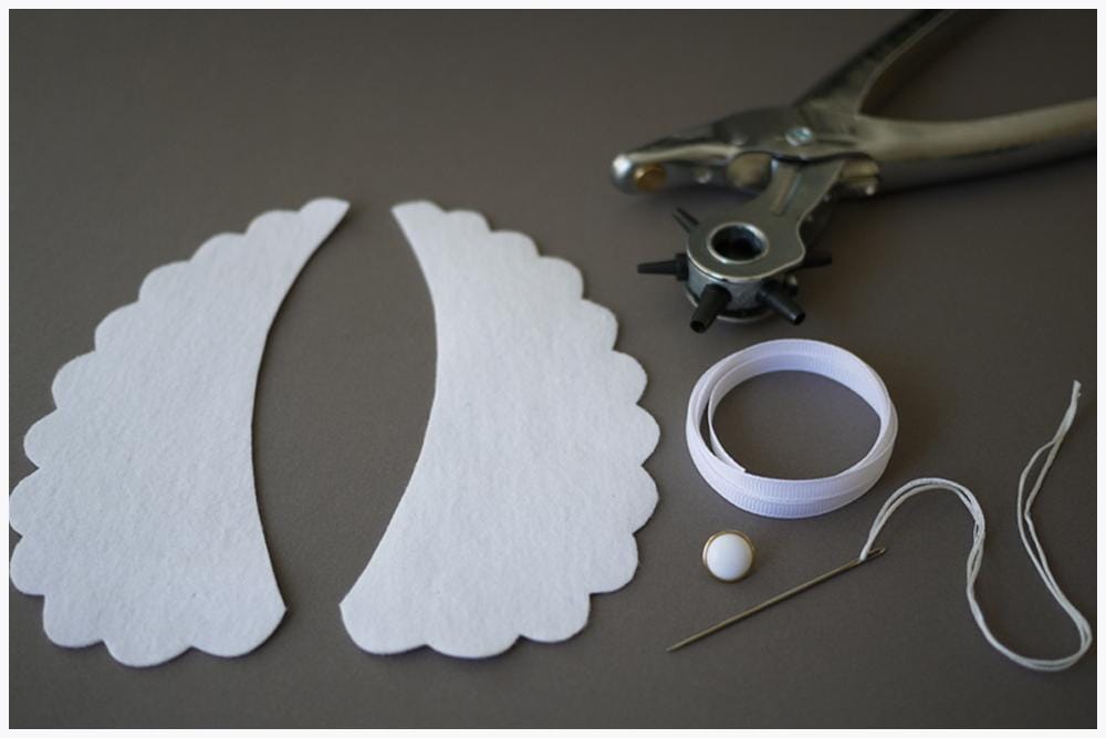 - 2 collar berbentuk kerang berwarna putih, bisa kamu gunting dari bahan yang berwarna putih atau flannel. Kamu bisa download patternnya di sini