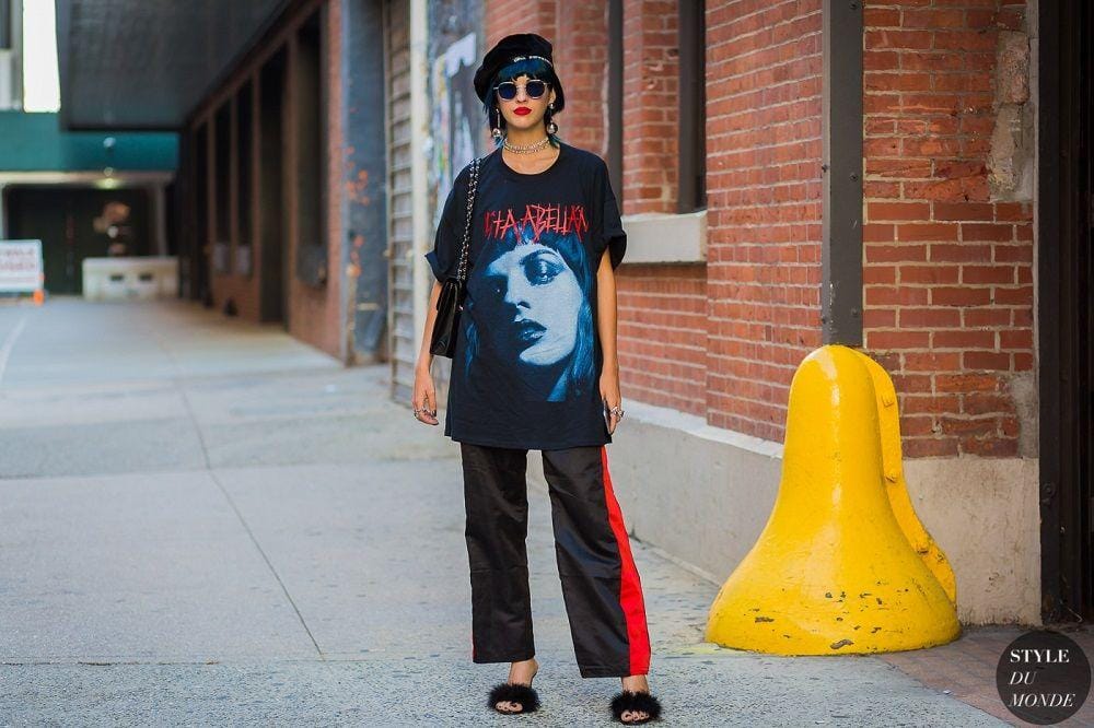 Meski memakai T-shirt bukan berarti total look selalu memberikan kesan yang kasual lho! Bikin T-shirt milikmu 180 derajat lebih menarik saat dipasangkan dengan topi baret. Nah, sebagai pelengkap alas kaki yang statement, misalnya fur sandal.