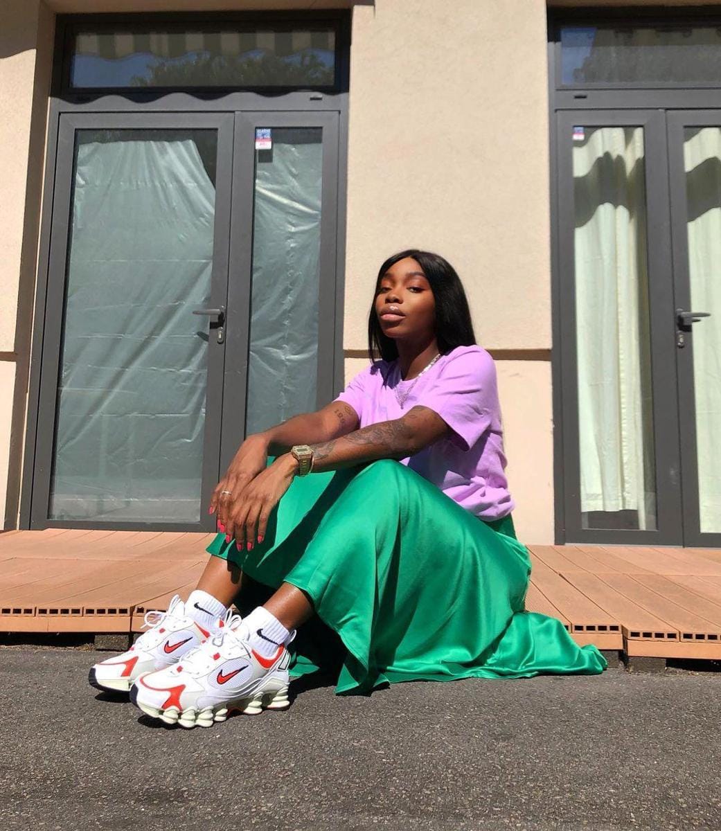 5. Ciptakan OOTD kekinian cukup dengan memasangkan<i> lilac tees</i> dengan rok hijau bahan satin dan sepatu olahraga.