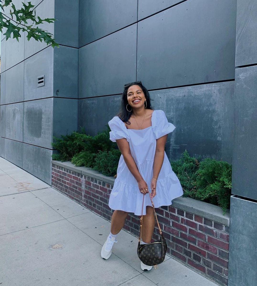 2. Perpaduan antara<i> mini dress </i>dengan sepatu olahraga akan menciptakan gaya manis yang <i>sporty</i>. Jangan ragu untuk sematkan beberapa aksesori sebagai penyempurna penampilan.