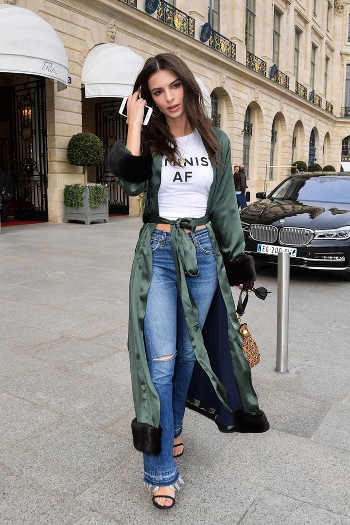 1. Spotted! Emily Ratajkowski memilih memadukan feminist tee dengan pajama robe yang stylish.