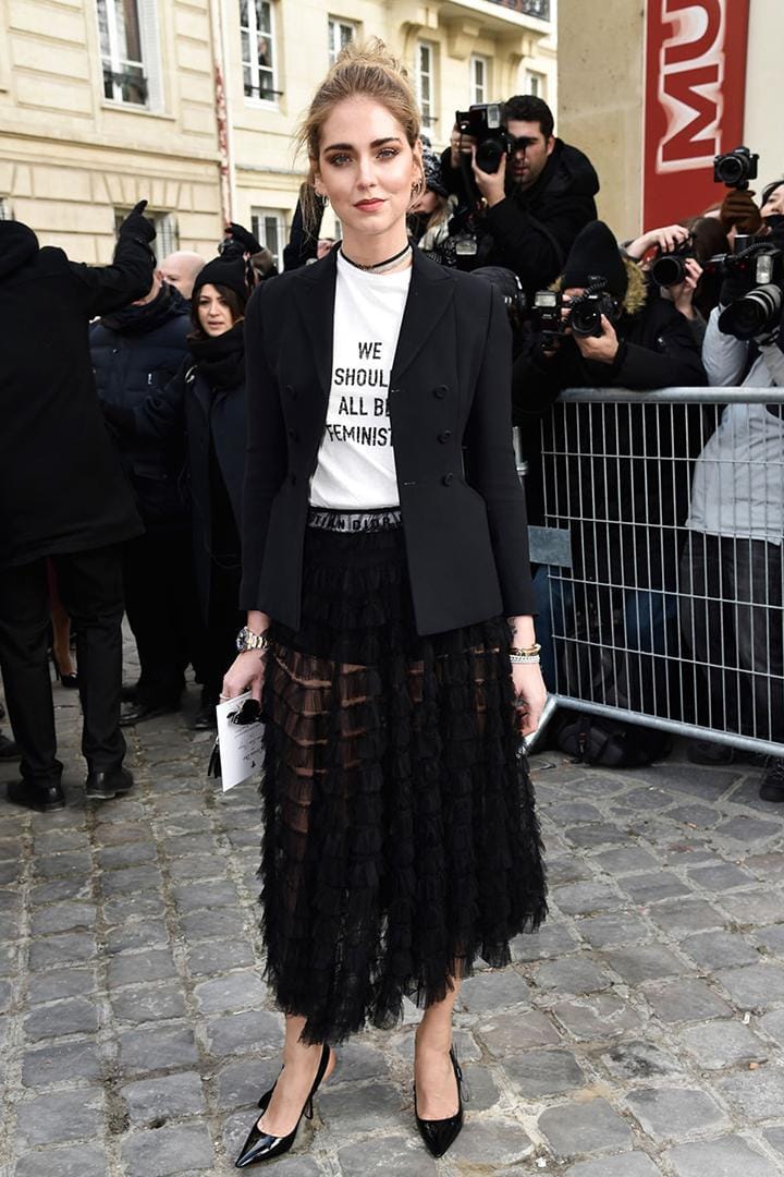2. Mengadiri Christian Dior Haute Couture Spring Summer 2017, Chiara Ferragni tampak mengenakan feminist tee yang dipadukan dengan black outfit.