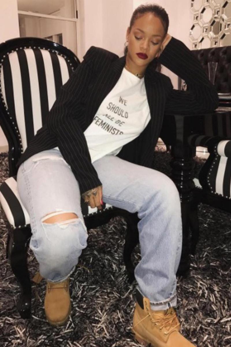 6. Rihanna lebih memilih memadukan kaos Dior nya dengan boyfriend jeans dan blazer.