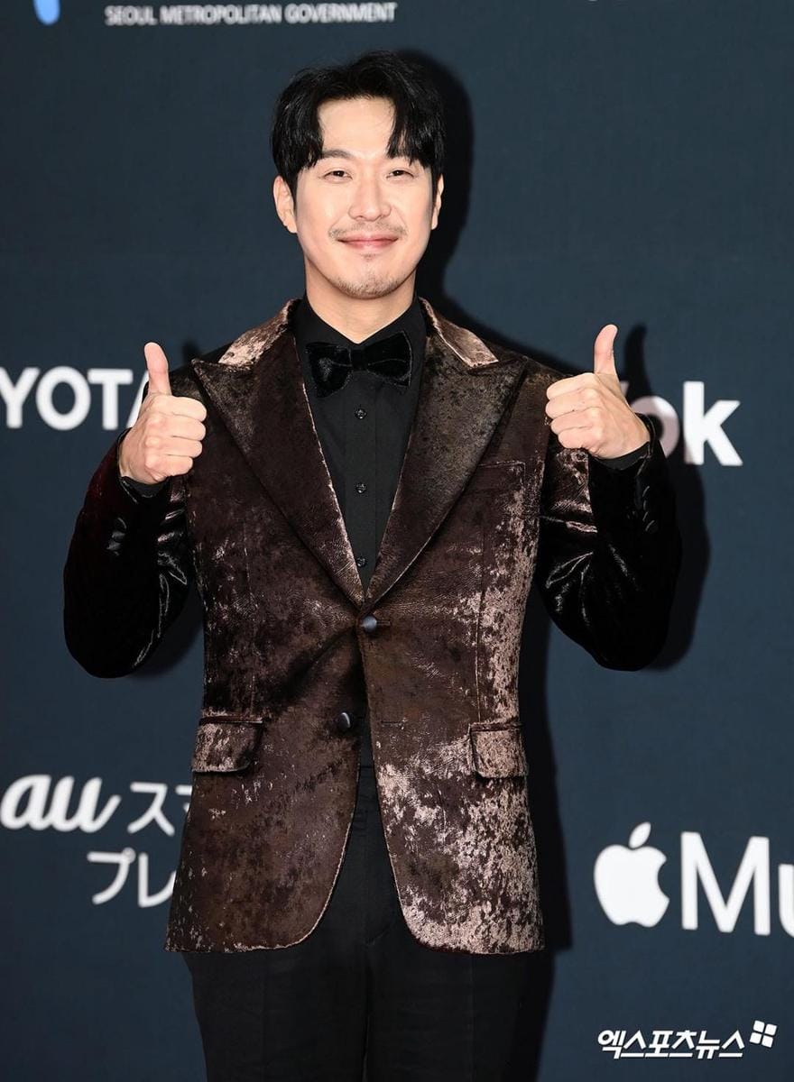 12. Ha Dong Hoon atau biasa dikenal dengan Haha tampil keren mengenakan <i>brown velvet blazer. </i>