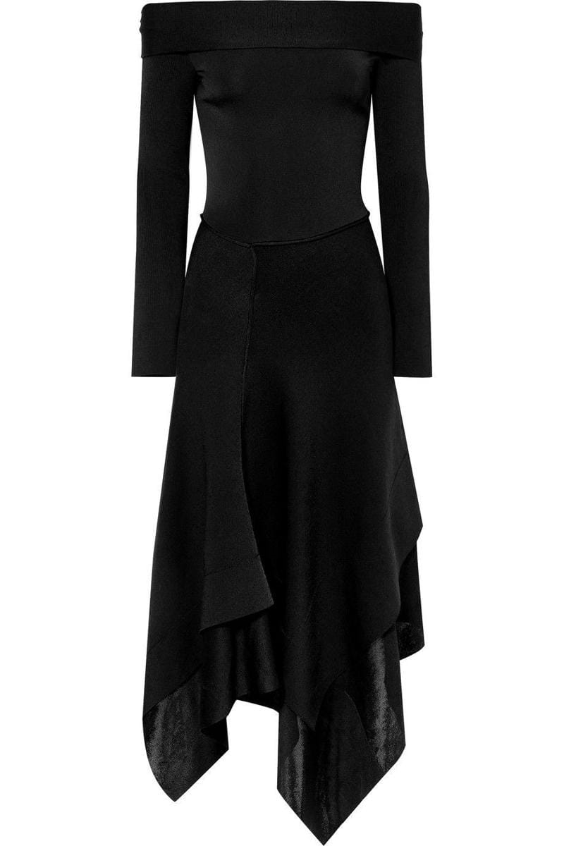 Off-the-shoulder asymmetric stretch-knit midi dress, Victoria Beckham, $1,673