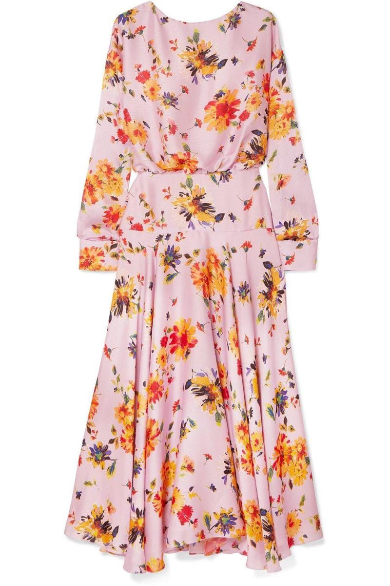 Majorelle gathered floral-print plissé-satin midi dress, Galvan, $1,041