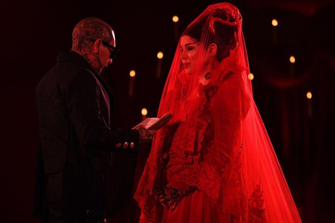 8. Kalau yang lain cantik-cantik, Kat Von D memakai gaun pengantin merah darah yang bold. Seram tapi anggun.