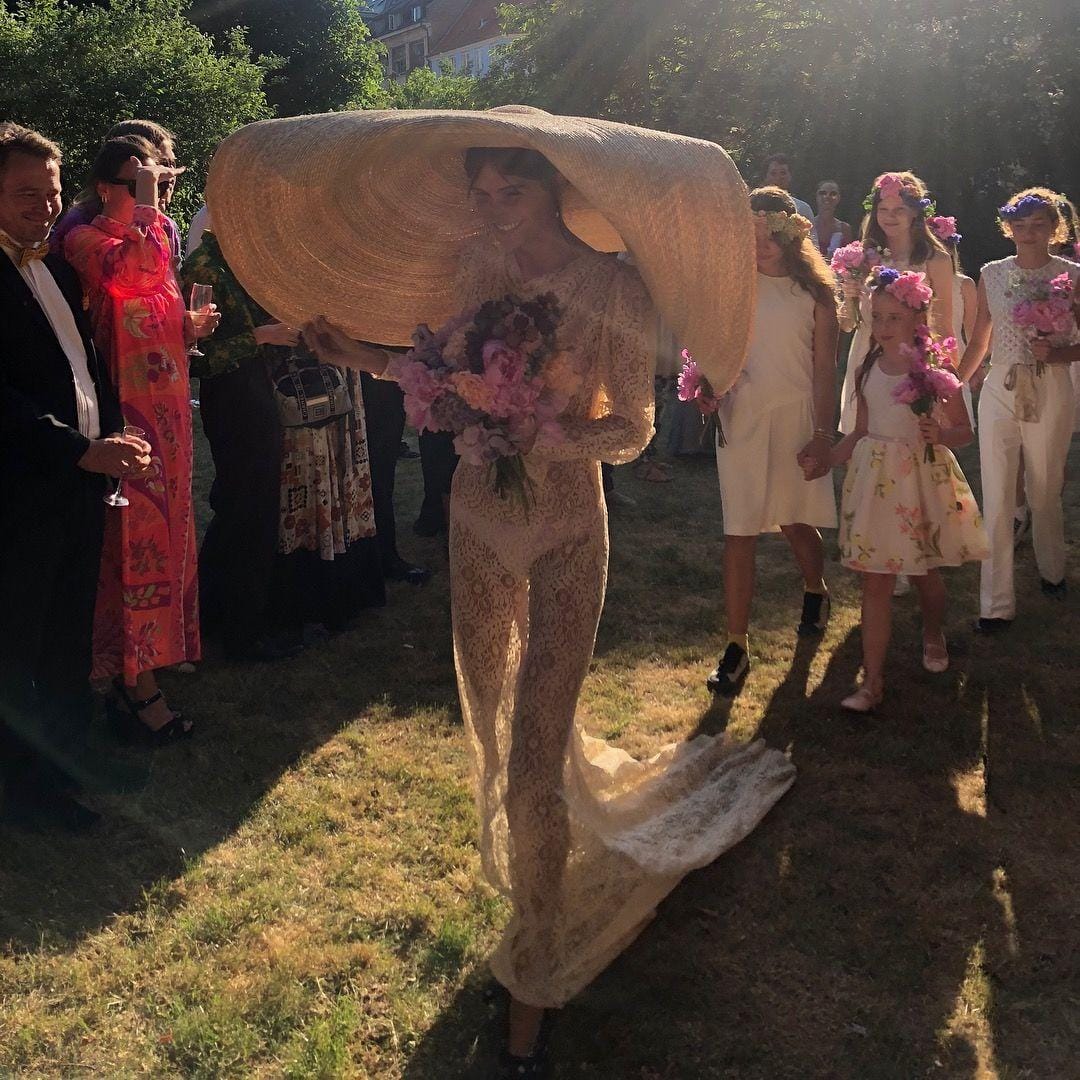 2. Model asal Denmark, Emma Leth menikah dengan gaun pengantin tembus pandang dan topi super besar yang statement.