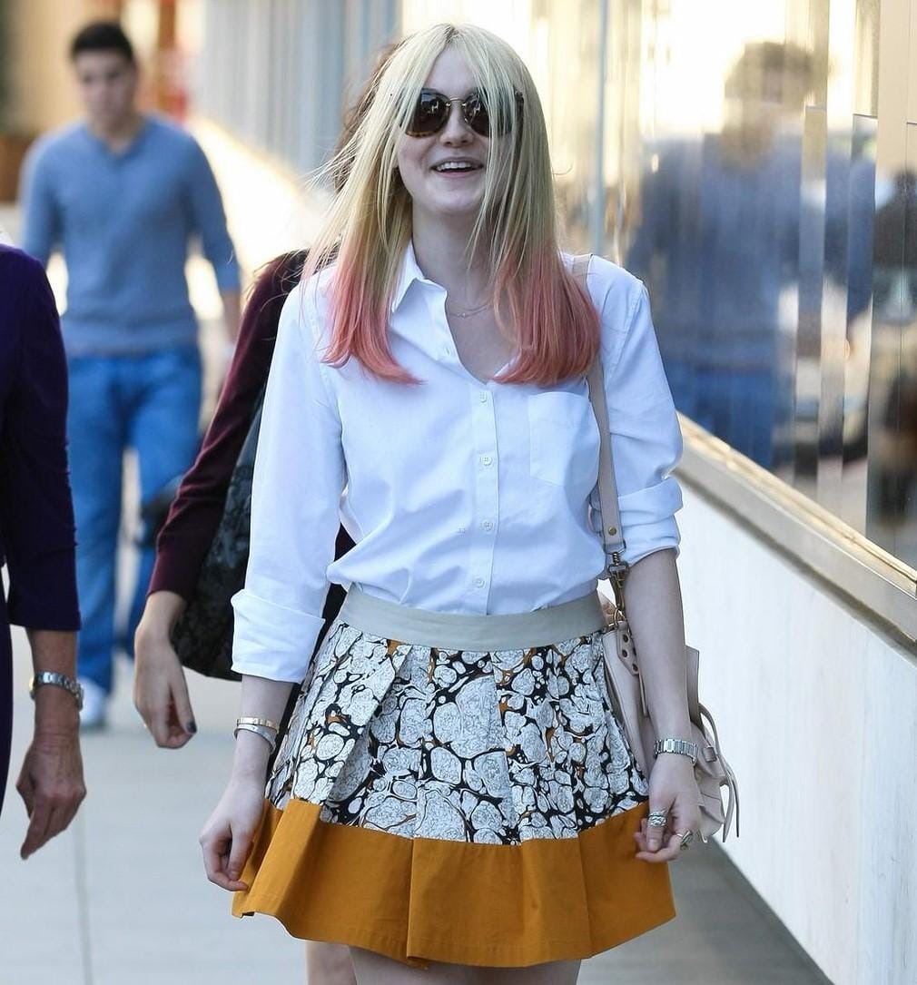 5. Dakota Fanning memperlihatkan gaya kasualnya yang memasangkan kemeja putih dengan rok mini batik saat berjalan-jalan di pusat kota.