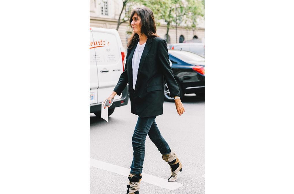 Kalau kamu sudah bosan memadukan skinny jeans dengan ankle boots klasik, sepatu flat, atau sneakers, coba deh kombinasikan dengan boots yang unik seperti gaya Emmanuelle Alt ini. Chic banget.