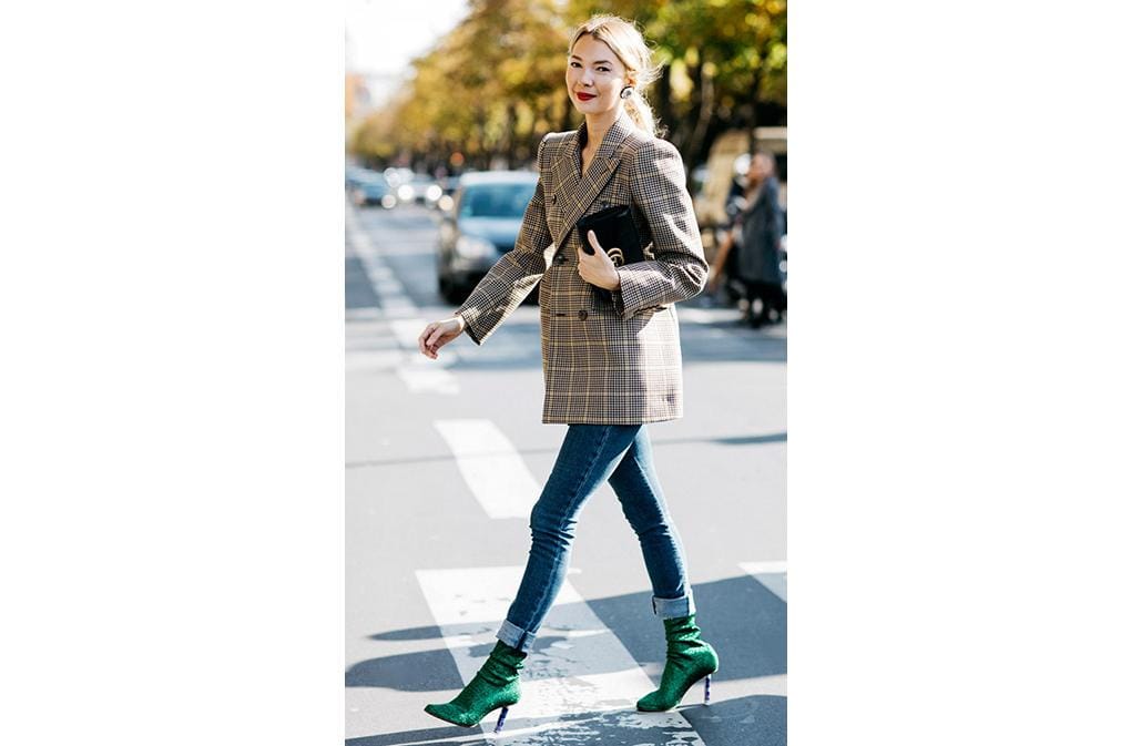 Gaya seperti ini sedang kekinian lho. Dimana skinny jeans akan terlihat makin kece dengan kombo blazer kotak-kotak dan statement sock boots.
