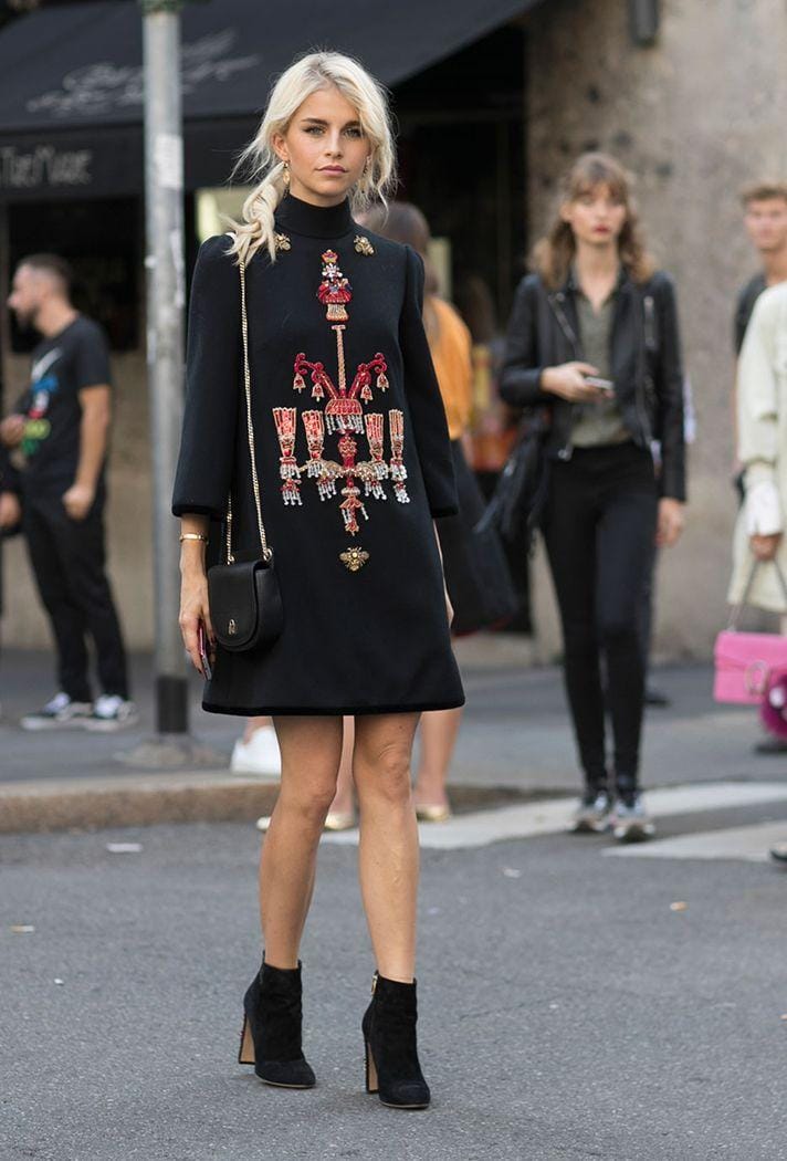 Warna hitam wajib banget ada di wardrobe kamu! Buat kamu yang memiliki personal style edgy dapat meniru look kelima ini. Dengan ornamen yang membuat lebih formal, long sleeve dress beraksen embellished padu padankan dengan boots warna hitam.