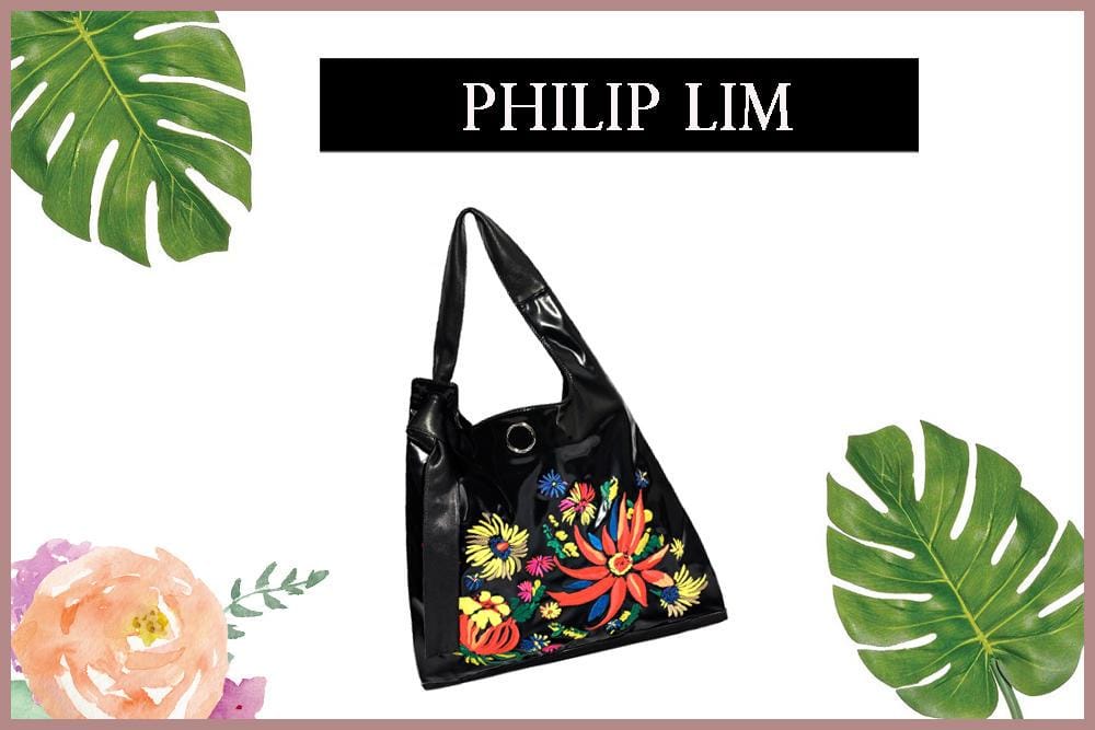 Desainer Philip Lim, mengeluarkan tas warna hitam, pleather vinyl dan diberikan sentuhan folkloric modern dengan bunga border cerah pada tas.