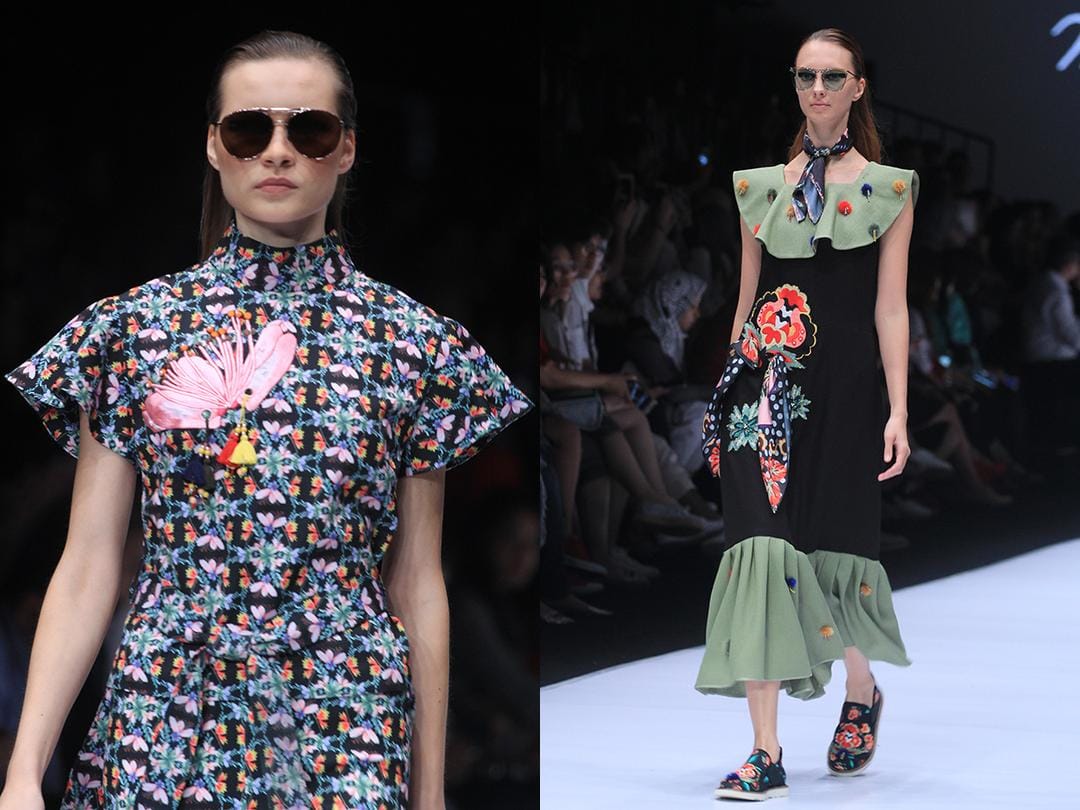 Jika di Spring/Summer 2017 ini banyak desainer yang mengambil unsur (yang sudah) indah dan diterjemahkan ke konteks yang cantik feminin pada biasanya, Mel Ahyar untuk lininya Mel Ahyar First membalikkan situasinya. Dark Blossom mengambil makna bunga-bunga yang tumbuh dengan indah di kegelapan. Dimana Mel Ahyar banyak memakai dasar hitam untuk menghidupkan motif-motif bunga yang di-print, bordir dengan warna yang pop-up. Desain signature Mel Ahyar pun tampak familiar. Siluet oversized, sentuhan etnik, detail tassel. Efek akhirnya masih terasa tetap folksy tapi lebih flamboyan. Sisi 70's pun diinjeksikan lewat berbagai mock dress, bell buttom, hingga aksesori kacamata bergaya jadul yang terlihat quirky - plus sepatu slip-on berpita, dan semua masih make sense untuk dikenakan sehari-hari.
