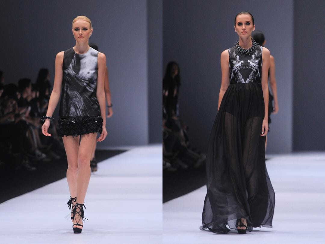 Unsur Ancient Roman hingga Italian Renaissance menjadi bottom line dari inspirasi Yosafat Dwi Kurniawan. Hari ini, Yosafat kembali "reminiscing" salah satu koleksi terbaiknya - dari JFW Spring 2013, yang bertema Borobudur. Terdengar "cheating", but it wasn't. Yosafat adalah seorang desainer. Dan ketika kita membahas apa yang diinginkan seorang desainer, tentulah penjualan yang meroket. Jadi masih sah lah, menerapkan "cara lama" yang diperbarui untuk meningkatkan sebuah daya jual. Seperti pada koleksi Borobodur, Yosafat memakai foto-foto trip-nya dari Yunani & Italia sebagai motif digital print yang focal, dimana secara grafik kualitasnya tampak pleasing! Bagian-bagian puing patung yang di-digitalize tampak diberbagai pieces seperti waist belt, yang menjadi semakin delicate ketika waist belt tersebut dipadukan dengan atasan sheer dan tailored pants. Sentuhan hard/soft yang kontras merupakan signature Yosafat Dwi Kurniawan, seperti yang terlihat pada dress soft draping yang dipadukan dengan celana pendek dan gladiator sandals - memberikan kesan wanita yang "anti-keanggunan" tapi penuh attitude.