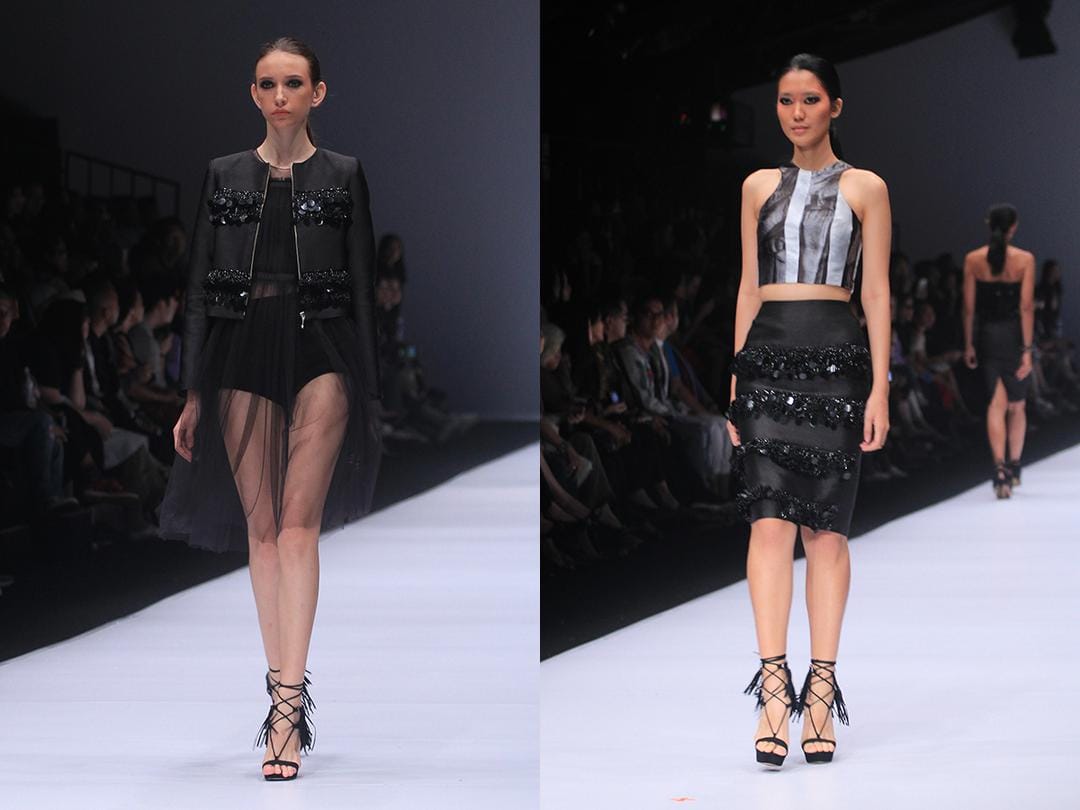 Unsur glamor digantikan dengan warna metalik yang hidup dalam bahan hitam yang selalu dipakai oleh Yosafat. Modern shapes - cropped top dengan pencil skirt - merupakan siluet khas-nya yang sekali lagi mudah kena ke hati para customer-nya. Jaket-jaket berbahan stiff yang dipadukan dengan busana tembus pandang juga terlihat seductive dan masih terlihat "ramah" untuk dikenakan para wanita masa kini. Dan satu lagi yang tidak boleh terlewatkan adalah skill Yosafat dalam menghadirkan tailored pieces patut diakui. Julia Kotuleva kembali menjadi model pembuka yang mengenakan tailored blazer yang terlihat strong sekaligus misterius.