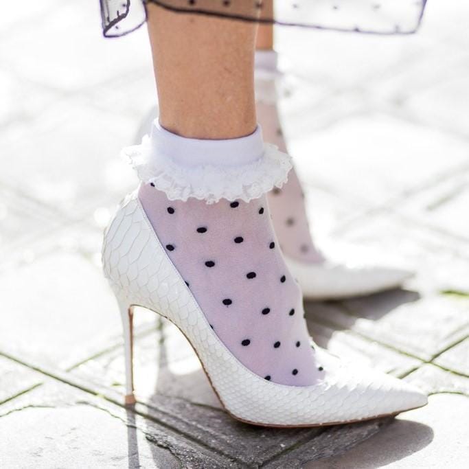 5. So chic! High heels putih ini terkesan lebih manis jika dipadukan dengan kaos kaki polkadot.