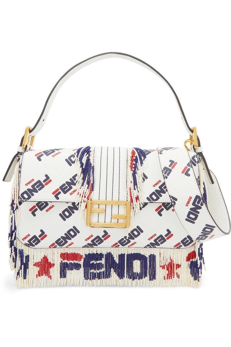 Baguette bead-embellished printed leather shoulder bag, Fendi, $4,351